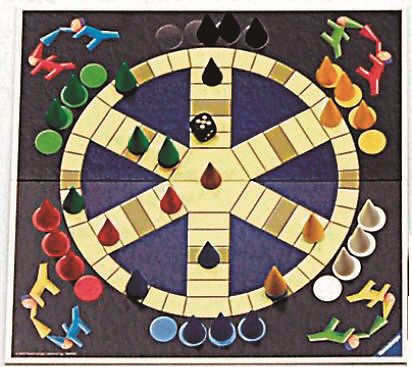 1927年当時からラベンスバーガー社が作ってきた定番ゲーム。サイコロを振って自分のコマを進めます。どの方向に進んでも構いません。相手のコマのいるマスにちょうど止まった場合は、そのコマに自分のコマをかぶせて捕まえます。自分の陣地に戻ったとき、捕まえたコマは自分のものになります。また、グレーのマスは安全地帯なので、捕まえることはできません。最後に自分の陣地にいる捕まえたコマの数で勝負が決まります。できるだけ多くの帽子を奪って、取られないように自陣に戻ります。戦略とサイコロの運が勝負を分ける、緊張感あふれるゲームです。