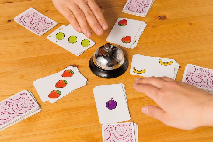 5種類のフルーツが描かれたカードととっても響きの良いベルがセットになったゲームです。順番に手持ちのカードをめくり、自分の前に置きます。場に出ている同じフルーツの数が5個そろったら素早く「チーン!」とベルを鳴らします。誰よりも早くベルを鳴らすことができた人は、今までめくった分のカードを全員からもらいます。間違えてベルを鳴らしてしまったら、自分の持っているカードから全員に1枚ずつ渡さなければなりません。よーく見て、素早く足し算をしなければならない判断力、瞬発力、数量の認識ゲームです。大人でも本気になるくらい楽しいゲームです。ベルを鳴らすのも楽しい家族や友達で大盛り上がりするゲームです。