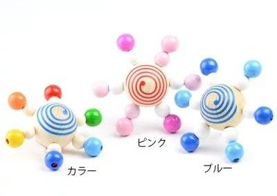 くるくる回るコマのラトルです。ラトルとは赤ちゃんがはじめて使う、ガラガラやおしゃぶりといった玩具です。木製のラトルは木自体に殺菌作用がありますので、お手入れも乾いたタオルでさっと拭いて頂くだけで大丈夫です。また、塗料・ワックス等は全て無害なものが使用されており、口に入れても舌を傷つけたり、パーツが外れてしまわないようにしっかりと固定されております。こちらのスターこまは、木の玉がゴムでとめてあり、柔らかくたわむ作りになっています。つまむ、曲げるといった指先の動きが簡単にでき、物をつかんだり、触ったりが盛んになってきた時期のお子さまにおすすめです。また、回すためのつまみはありませんが、渦巻きの本体を部分をもって、小さいお子さまでも簡単に回すことでき、両面どちらでも回すことが可能です。色鮮やかな玉がクルクル回ってとてもきれいなので、回してみせてあげると、とても喜びます。
