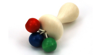小ぶりで軽いので、生後3ケ月ごろより持たせると良いでしょう。3つの玉がぶつかる素朴な優しい音がしますので、はじめは大人が話しかけながら振って見せ、木の玉がぶつかり合う心地よい音を聞かせてあげてください。なめても安心の塗料を使用していますので、そのうちに、玉を口に入れようと引っ張りますので指先の発達も促します。出産お祝いにも喜ばれる人気の玩具です。