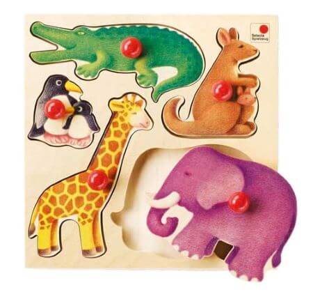 赤いポッチのつまみがつまみやすく、はじめて出会うパズルに最適です。愛らしい動物の絵が印象的で、印刷技術に光沢があり、きれいなのが特徴です。3本の指でつまんで動かして、形を合わせてはめ込めること、子どもが達成感を味わう大事な経験です。