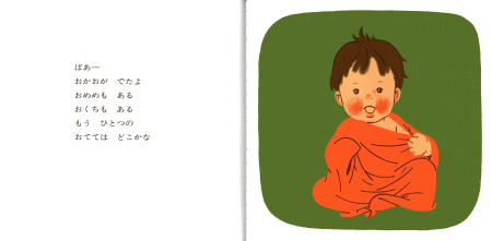 すっぽりかぶった服から、まずは「ぱっ おててが でたよ」。次は頭と顔が出ます「ばあー おかおが でたよ」もう一つ手も出して、最後は足。苦労しながらも、片足ずつ服から出して、おきがえできました!自分で洋服を脱ぎ着できるようになるのはとっても難しいこと。そんなあかちゃんが、からだの部分をひとつずつ確認しながら、一生懸命服を着て、できるたびに喜ぶ、表情豊かな絵本です。