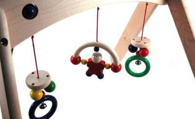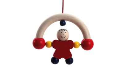 この商品は安全性の高い木製で作られており、色合いも大変美しく赤ちゃんのお部屋を彩ります。ゆるやかに動く木のがらがらは赤ちゃん自身が物に触ろうとする意欲を高めます。両端のリングを触ると木の玉がぶつかり合い優しく素朴な音がします。真ん中の人形は両腕を軸にしてクルクルと回転させることができます。ぶら下がっている木のおもちゃを叩いたり握ったりする事で、視覚・聴覚・触覚を刺激し脳の発達を促すと言われています。ネンネの時期、お座りの時期、つかまり立ちの時期と長い間大活躍します。