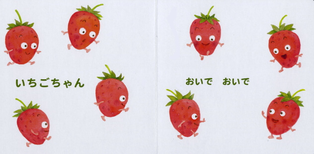 「いちごちゃん おいで おいで」水彩のやさしい色合いと、リズミカルなことばがかわいい、あかちゃんえほん。みんなのだいすきな、くだものが登場です!「いちごちゃん おいで おいで」のかけ声であつまった、いちごちゃんたち。行進したり、輪になったり、ぐるぐるまわったり、とっても楽しそう。ぐるりとまわって、最後はうれしいことがまっています!