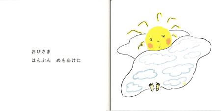 おひさまが雲のおふとんから出て大きなあくびをします。それから、歯を磨き、顔を洗って、おひさまがパッチリ目をあけます。「おはよう おはよう みんなおはよう」。おひさまが朝、目を覚まして、支度をし、お空に登場してくるまでをユニークに描いています。