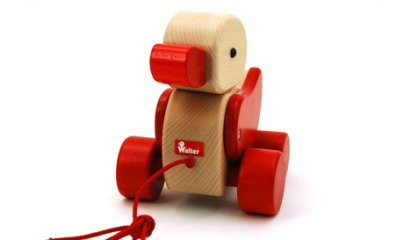 無垢のブナ材を使用したあひるのプルトーイです。首を振ったり、羽を動かしたりしながらあひるが歩きます。幼児と一緒に歩く姿はなんとも言えない可愛らしさです。歩き始めの子どもが引っ張って遊ぶのはもちろんのこと、ハイハイの時期は、大人が目の前で引っ張ってあげればハイハイしながらついてきたりもしますので、早い時期から楽しめます。
