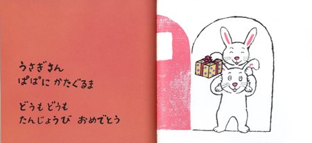 「きょうは うれしいたんじょうび ともだちたくさんくるかしら」そこへ、「とんとんとん」ねこさんがやって来ます。次にきりんさん、ねずみさん、うさぎさん・・次々に友達がプレゼントを持ってやってきます。
