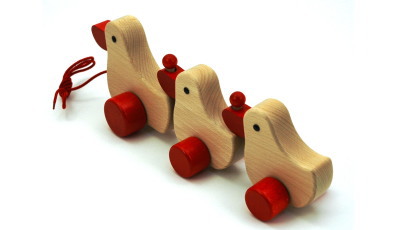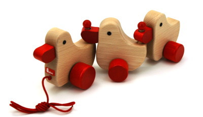 無垢のブナ材を使用したあひるのプルトーイです。首を振ったり、羽を動かしたりしながらあひるが歩きます。幼児と一緒に歩く姿はなんとも言えない可愛らしさです。歩き始めの子どもが引っ張って遊ぶのはもちろんのこと、ハイハイの時期は、大人が目の前で引っ張ってあげればハイハイしながらついてきたりもしますので、早い時期から楽しめます。