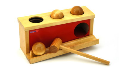 木製のハンマーでボールをたたきます。たたくと下の穴からボールが転がり出てきます。
