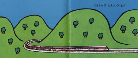 線路の絵からはじまり、鉄橋、トンネル、踏み切りを通りぬけ、山、街、草原、川などを背景に走って行く電車。さまざまな電車を、わかりやすい文章と明るい色使いで描いているので、赤ちゃんの興味をひきつけます。