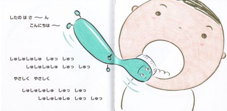 はぶらしくん、おしごとの時間です。あーんしてもらったら、うえの歯さんからこんにちは。しゅしゅしゅしゅ しゅっしゅっ、やさしくみがきます。お次は、したの歯さん!おく歯のみなさんも歯のうらさんも、しゅっしゅっしゅっ……とみがいたら、おしまいでーす。はぶらしくんのおしごとかんりょう!ピカピカになりました。はぶらしくんを応援したくなる! はみがきが楽しくなる!たのしいいちにちシリーズです。