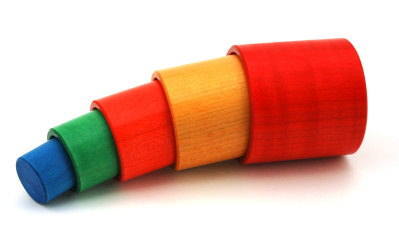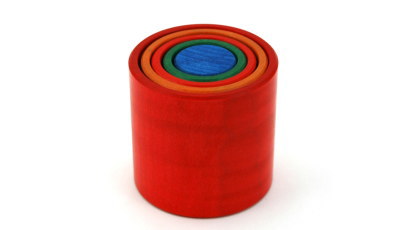 木製カップがカップの中におさまっていきます。子どもは、中に入れたり、出したり、上に積み上げたりして遊びます。なんどもなんども繰り返し遊ぶことでしょう。そのたびに小さな子どもは、新たな発見やできなかったことができるようになる達成感を味わっているのです。5色のカップの色合いがなんとも美しく仕上げられています。