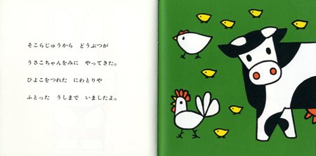 うさぎのふわふわさんとふわおくさんはとっても仲良しです。あるひ、ふわおくさんのところに天使がやってきて、かわいい赤ちゃんが生まれました。ふたりは赤ちゃんに「うさこちゃん」という名前をつけます。太った牛ににわとり、たくさんの動物がうさこちゃんを見にやってきて、ふたりにお祝いの言葉を贈ります。「うさこちゃん」シリーズの代表作。世界40言語以上に翻訳されているディック・ブルーナの絵本です。