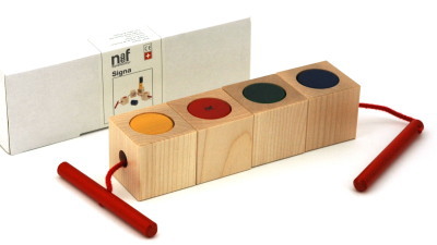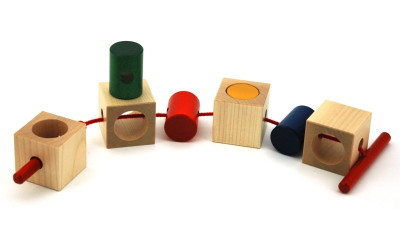 一番最初の紐とおし遊びです。木製の円柱の棒を立方体の穴にとおしていくものです。まずは、大人が立方体の穴に、円柱の棒がすっぽり入るところを子どもに見せてあげましょう。子どもはすぐに興味を持って自分でやりたがります。右手・左手を上手に使わなければ、円柱の棒といえども穴には入りません。つたない手つきでも、穴にとおすこができるので満足感が味わえます。積木遊びとしても使えます。