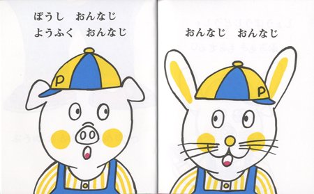 幼児は、同じものを見つけるのが大好きです。たとえば自分が赤い服を着ていたら、赤色を見て、”おんなじ”と。この絵本の中には、ぶうとぴょんが互いに”おんなじ”を見つけ合います。くつや帽子、おもちゃ、自動車・・・幼児の好きなものが次々と出てきます。