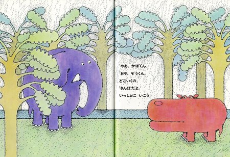 ぞうくんはさんぽに出かけました。かばくんに出会って、さんぽに誘うとかばくんはぞうくんの背中に乗りました。わにくんに出会って、さんぽに誘うと、わにくんはかばくんの背中に乗りました。最後にかめくんに出会って、かめくんがわにくんの背中に乗ると、ぞうくんが重さにたえられなくて、池にみんな落っこちてしまいました。単純にデザインされた動物たちのユーモラスなやりとりが、愉快な散歩に子どもたちを連れていってくれます。