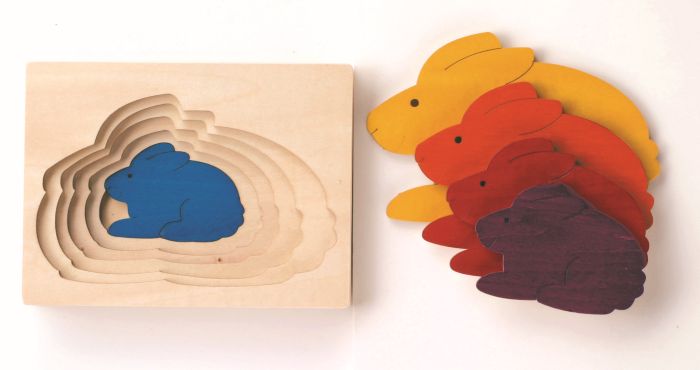 小さい形から大きい形へ大きさが段階的に変わっていく5層のパズルです。それぞれの層が1枚の木板でできているので、小さな子どもにも遊びやすく初めてのパズルにおすすめです。グラデーションも楽しめます。