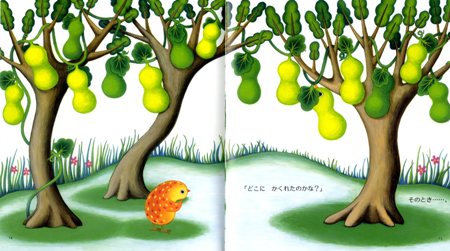 うずらちゃんとひよこちゃんがかくれんぼを始めました。自分たちの体の模様や色・形を上手に使って、花に隠れたり、ひょうたんに隠れたり、器用にかくれますが……。鮮やかな色づかいと斬新なデザイン感覚で、一気にうずらちゃんとひよこちゃんのかくれんぼの世界に引き込まれます。「いないいないばあ」の遊びが好きな子どもたちにぴったりな、愉快な2羽と一緒に楽しいかくれんぼ遊びのできる絵本です。