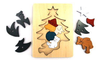 小さなサイズの2重パズルです。2重パズルとは、1枚のボードにパズルが2層にカットされたパズルのことです。クリスマスツリーの影には、くまやぞう、かわいいおもちゃが隠れています。何度も遊んで自信をつけるのにちょうどいいサイズなので、小さい子でも楽しめます。層になったパズルから順番を学び創造力を駆使して、まるでかくれんぼを楽しんでいるような気分にもさせてくれます。