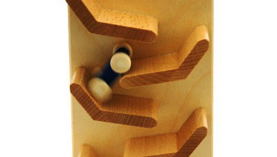 このおもちゃは、1両または2両の車がリズミカルに落ちてゆくおもちゃです。落ちるスピードは速いのですが、狭い範囲での縦の動きは目がとらえやすいため、小さな子どもでも充分に追うことができます。車がカタカタとやさしい音をたてながら落ちていき、子どもの目の動きの運動を助けます。追視運動や集中力を育てます。シンプルな作りの車が見事なスピードで落ちていく様子を見ていると、思わず見とれてしまい、何度も何度もやってみたくなる魅力にとりつかれる人気の玩具です。ドイツの「子供の遊びと玩具審議会」が良い玩具として推奨するものだけに貼る事が許させる「オレンジマーク」(spiel gut:シュピールグート)を取得しています。