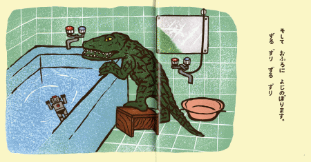 ワニのわにわにはおふろが大好き。おふろ場にやってきて、蛇口をひねってお湯を入れ、お湯につかっておもちゃで遊びます。せっけんのあぶくをとばして遊んだあとは、シャワーをマイクに歌までうたうのです! おふろから出ると、ちゃーんとタオルで体をふきます、“ぐにっぐにっぐなっぐなっ”っとね。少し不気味さの漂う木版のわにわにの、存在感、迫力感。間違いなく子どもたちはわにわにが大好きになるのです。