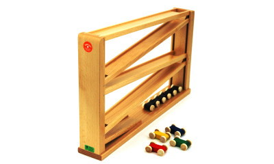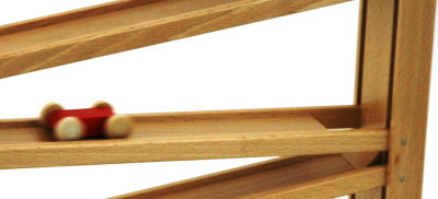 1両の車が眼で追えない幼い子どもでも、長い4両車なら眼で追うことができます。追視運動や集中力を育てます。シンプルな作りの車が見事なスピードで落ちていく様子を見ていると、思わず見とれてしまい、何度も何度も繰り返しやってみたくなる魅力にとりつかれる人気の玩具です。車は、ジャンピングカートレインと共通で使えます。
