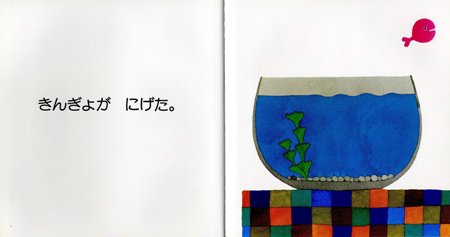 きんぎょが1ぴき、金魚鉢からにげだした。どこににげた? カーテンの赤い水玉模様の中にかくれてる。おや、またにげた。こんどは鉢植えで赤い花のふり。おやおや、またにげた。キャンディのびん、盛りつけたイチゴの実の間、おもちゃのロケットの隣……。ページをめくるたびに、にげたきんぎょがどこかにかくれています。子どもたちが大好きな絵探しの絵本。小さな子も指をさしながらきんぎょを探して楽しめます。