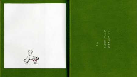「おかあさんがあんでくれた ぼくのチョッキ ぴったりにあうでしょ」と、大きなページの中にポツンとちいさいねずみくんが赤いチョッキを着て立っています。アヒル、サル、アシカ、ライオンなど仲間の動物たちが次々と「ちょっときせてよ」と現れます。ページをめくるごとに、どんどん大きな動物が現れ、とうとう細いひものようになってしまったねずみくんチョッキ。小さなチョッキを次々に着る動物たちの表情がユーモラスに描かれています。チョッキだけに赤い色をつけた絵は周囲を線で囲んで、余白を多く取り、主人公たちの動作をより明確にしています。