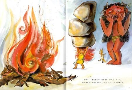 山姥の娘まゆは、ある日鬼に会います。鬼はまゆを煮て食べようとお湯を沸かしはじめます。まゆはそうとは知らず、薪の山を作ったり、かまどの石を積んだり、手伝います。その怪力に驚いた鬼も、鍋のお湯が沸くころには、もうすぐまゆを食べられるとにんまり。ところがお湯が沸くと、風呂を沸かしているとばかり思っているまゆは、「お先にどうぞ」と言うなり、鬼を鍋に放り込んでしまいます……。