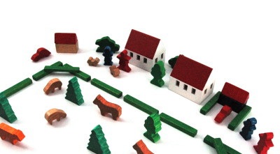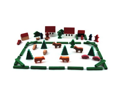家は5㎝、馬は2.5cm、木は3.5cmの高さのミニ積木です。50年近く前から黄色い網袋に入って売られてきました。小さなかわいらしい世界を作るこの積木は、ヨーロッパの伝統的な玩具で、よく乾燥させた堅いブナ材を使用し、1つずつ角が磨かれ、色は透明感のある染付けです。汽車セットなど、いろいろな積木と組み合わせて遊ぶと遊びの幅が広がります。
