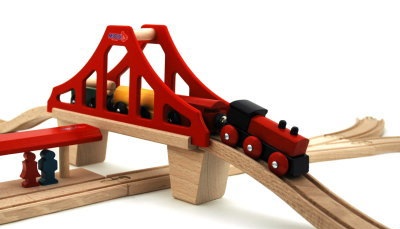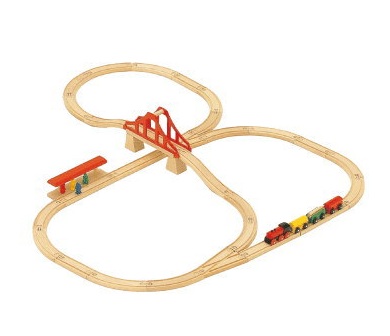 カラフルな4両の汽車とつり橋を中心として大きなループを描くようなレイアウトのセットです。汽車の連結部分は磁石で簡単に組み合わせが変えられます。レールのジョイントは着脱が可能で、子どもの扱いでも折れにくいプラスチック製です。ジョイントの場所を変える事で組み合わせの可能性が広がります。レールは両面使用可です。