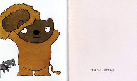 お風呂に入る時間です。「はだかんぼになりなさい」と、おかあさんが言っています。すると、ライオンは「すぽっとはずして」。次々に脱いでいく様子がユニークに描かれています。