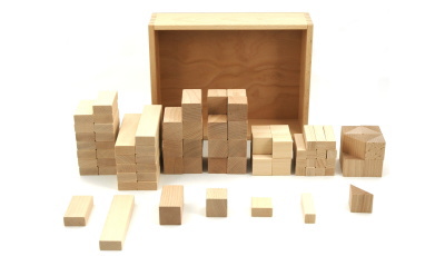 基本の形は左端のレンガ形です。縦:横:高さが、1:2:1/2になっています。1が基本の尺度でこの積み木はドイツの教育学者フレーベルの理論により3.3cmになっています。