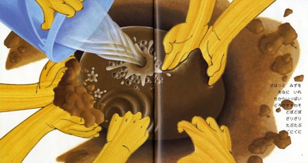 子どもたちが大好きな泥遊び。泥を掘って、水を入れて、ぐにぐにかき混ぜながら、泥のスープを作ったり、泥のクッキーを作ったり……。ひとしきり遊んだら、今度は固くて光る泥だんご作りに挑戦。泥の固まりに、乾いた砂をまぶして、更に握っているうちに、「できたぞできたぞどろだんごずっしんずっしんてつのボールだぼくのはすずめのたまごだよわたしのぴかぴかひかったよ」。