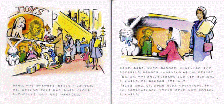 デパートのおもちゃ売り場に売られている、くまのぬいぐるみのコールテンくん。ある夜、なくなったズボンのボタンを探しに出かけ、エスカレーターを山だと思ったり、家具売り場を王様のお城だと思ったり、初めて見るものに驚きます。ところが、次の日にコールテンくんはある女の子に買われて、女の子の家に暮らし、友達ができた喜びが描かれています。