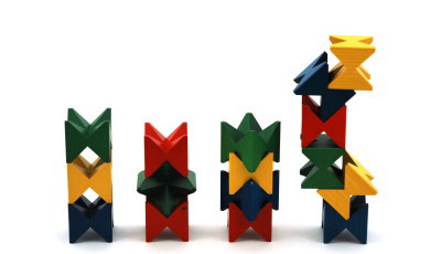 この積み木は、側面が90度にカットされており、リボン型(蝶型)になっているので、様々な積み方が創造でき、とてもバリエーション豊かな積み木として遊べます。面での積み上げ、点で積み上げ、引っ掛け、バランス積み、更には、これら積み上げ要素すべてを駆使して造形遊びが可能となります。形だけを見ると「難しそう」という印象ですが、リボンの形がかみ合う事によってバランスがとりやすく、まだ手先のつたない小さい子どもでも上手に積むことができます。「ネフスピール」の素晴らしい点は、小さい子どもでも遊べる容易さと、小学生でも楽しめる複雑さを兼ね備えている点です。対象年齢は3歳〜となっておりますが、それ以下の子どもでも並べてモザイク遊びをしたり、2、3個を使って積んだりと十分楽しめます。
