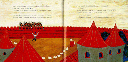 赤いガウンのコロコロ太った王様と、まるまるとした白いめんどりが、大きな画面いっぱいに駆け回る姿が愉快です。