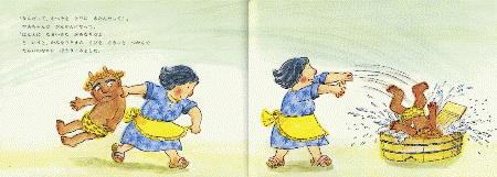 洗濯が大好きなかあちゃんは洗濯板で、家中のものすべてを洗ってしまいます。子どもたち、猫や犬、靴や傘まで、みんな洗濯して干されています。干された子どものへそを狙って雷さまが落ちてくると、かあちゃんは雷さままで洗濯! ゴシゴシ洗ったので、雷さまの顔からは、目も鼻も口もきれいさっぱり。でも大丈夫、かあちゃんに新しい顔を描いてもらい大満足で、空に帰っていきました。しかしその翌日、さらにびっくりすることが……。