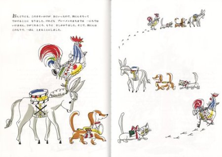 飼い主に見放されたロバとイヌとネコとオンドリが、ブレーメンの町の音楽隊に入ろうと出かけます。途中で日が暮れて、やっとたどりついたのは、なんとどろぼうの家でした。オンドリはネコの上に、ネコはイヌの上に、イヌはロバの上にたって、いっせいに窓から部屋へなだれこみました。驚いたどろぼうたちはいったんは逃げだしますが、再び家にもどってきます。4ひきは家の中で寝ていましたが……。ゆかいなグリムの昔話絵本です。