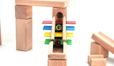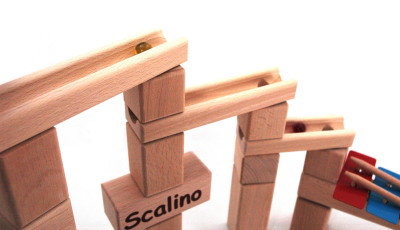 遊ぶ道具を自分で作るのがスカリーノです。NHKのピタゴラスイッチと言えばピントくる方もいらっしゃると思いますが、今では多くの子どもたちの手に渡っています。スカリーノは溝が切られたレールの上を玉が転がっていくおもちゃです。組み合わせは無限で好きな方向・組み合わせを考えながら積木のように積んでいきます。子どもは、積み木の組み立て方と玉の落とし方を試行錯誤し、玉が最後まで転がった時には達成感を味わうことでしょう。