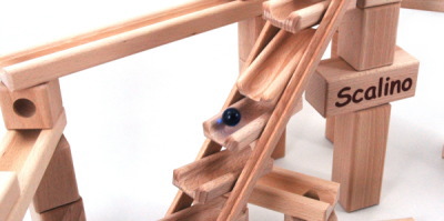 遊ぶ道具を自分で作るのがスカリーノです。NHKのピタゴラスイッチと言えばピントくる方もいらっしゃると思いますが、今では多くの子どもたちの手に渡っています。スカリーノは溝が切られたレールの上を玉が転がっていくおもちゃです。組み合わせは無限で好きな方向・組み合わせを考えながら積木のように積んでいきます。子どもは、積み木の組み立て方と玉の落とし方を試行錯誤し、玉が最後まで転がった時には達成感を味わうことでしょう。