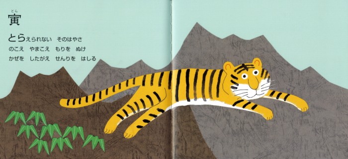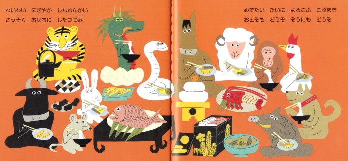 元日に、十二支の動物たちが新年会へ。おせちでお祝いの前に、まずは語呂のよい言葉にのせてそれぞれをご紹介します。最後はそろって金屏風の前でごあいさつ。伝統的な動物たちのイメージを楽しい切り絵で届けます。